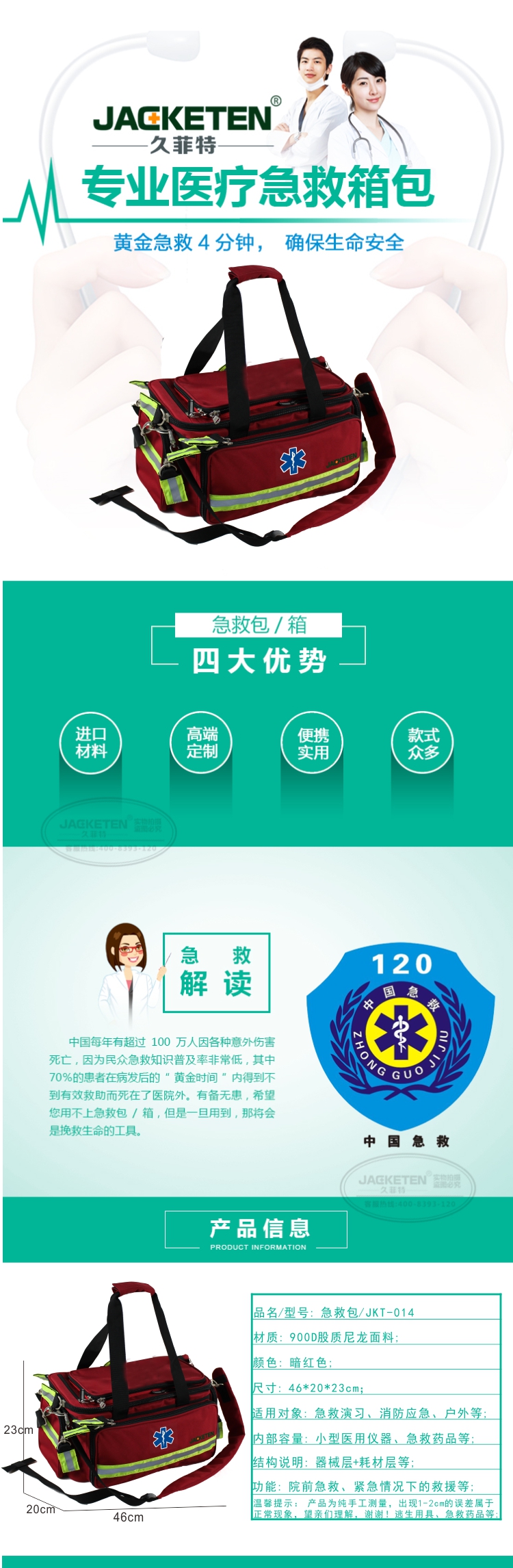 品名/貨號:急救包/JKT-014;材質(zhì):900D股質(zhì)尼龍面料;顏色:暗紅色;尺寸:46*20*23cm;適用對象:急救演習、消防應(yīng)急、戶外等;內(nèi)部容量:小型醫(yī)用儀器、急救藥品等;結(jié)構(gòu)說明:器械層+耗材層;功能:院前急救、緊急情況下的救援等