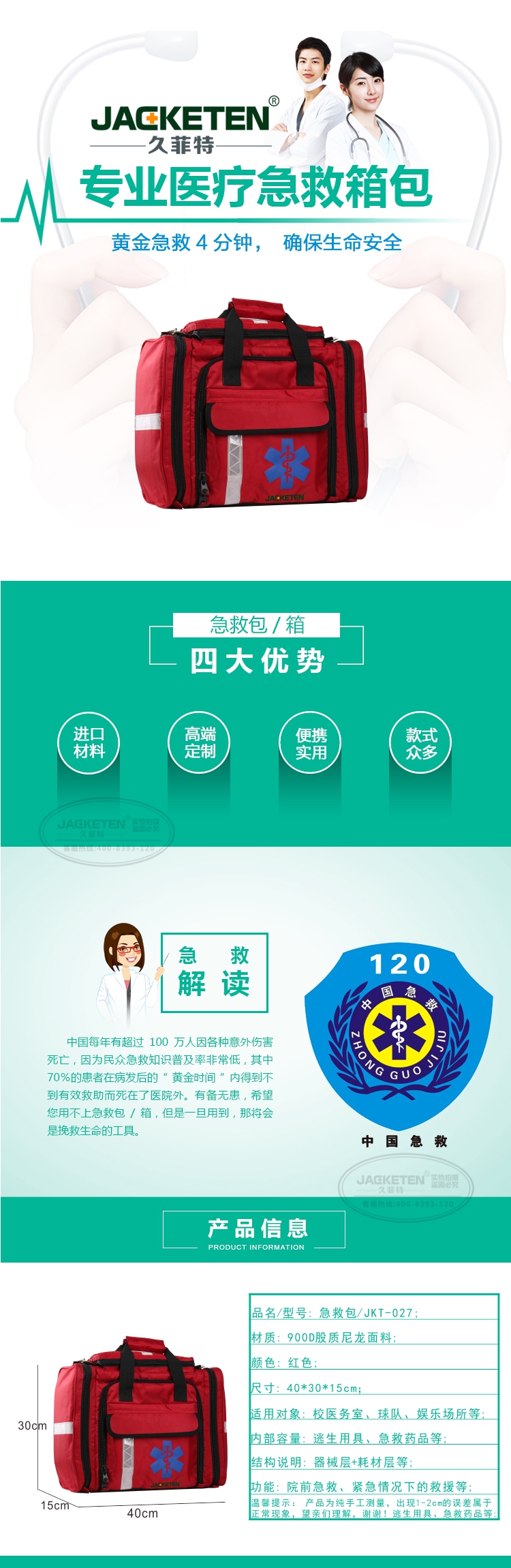 品名/貨號:急救包/JKT-027;材質(zhì):900D股質(zhì)尼龍面料;顏色:紅色;尺寸:40*30*15cm;適用對象:校醫(yī)務(wù)室、球隊、娛樂場所等;內(nèi)部容量:逃生用具、急救藥品等;結(jié)構(gòu)說明:器械層+耗材層;功能:院前急救、緊急情況下的救援等
